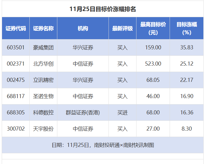 南财投研通数据泄露,11月25日,券商赐与上市公司缠绵价共6次,按最新收盘价斟酌,缠绵价涨幅排行居前的公司有豪威集团、朔方华创、立讯精密,缠绵价涨幅折柳为35.83%、25.12%、22.17%,前两者齐属于半导体行业、后者属于浪掷电子行业。